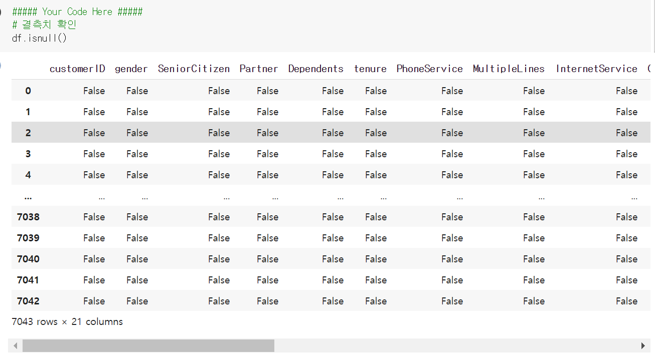 2. 결측치가 있는지 isnull()함수를 이용하여 확인하고 결과값 확인