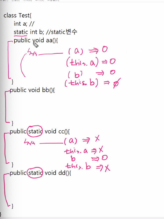 public void aa(){ => non static은 다 된다. 안되는 것 없다.