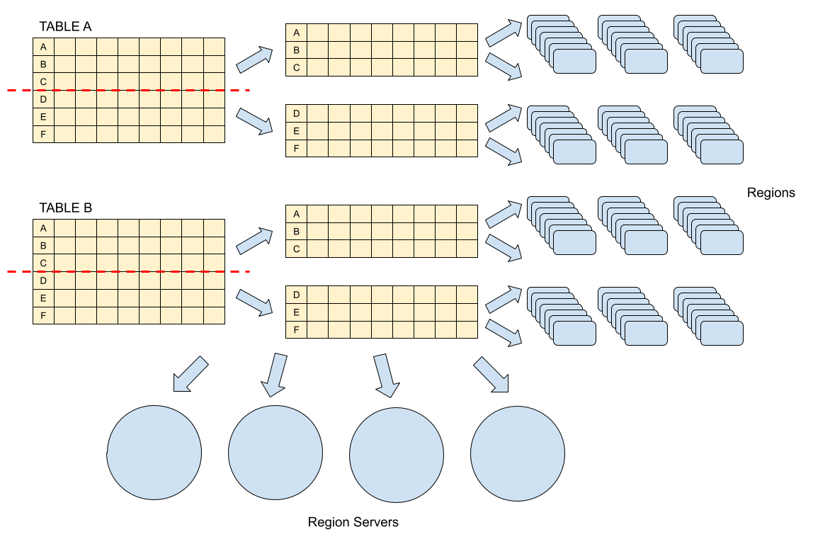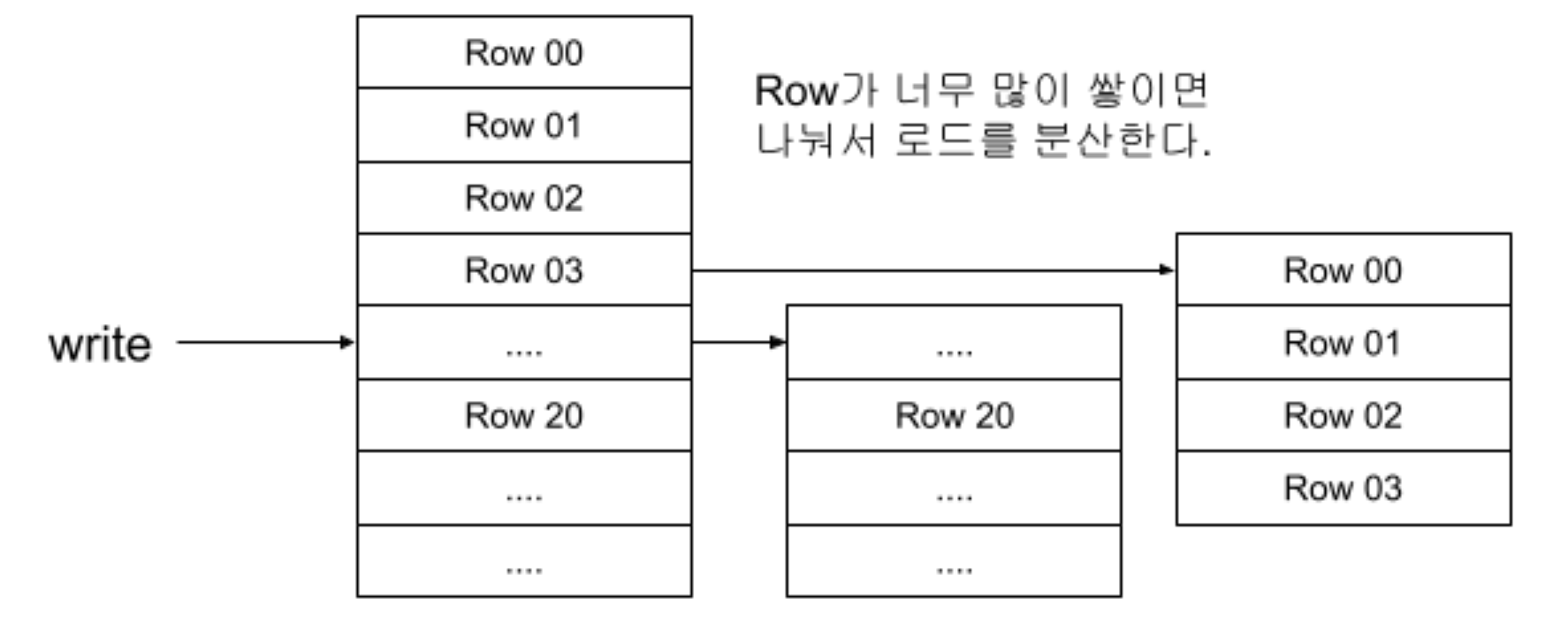 Region은 함께 저장되는 테이블 데이터의 부분 집합이다. 처음 테이블에는 오직 한개의 region만 존자해고, 만약 Region에 많은 row 들이 추가되서 그 크기가 너무 커지면, 중간키를 이용해서 region을 반으로 나눠서 저장한다.