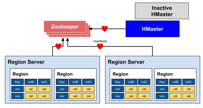 하나의 활성화 HMaster를 제외하고는 나머지는 Slave => 이 또한 주키퍼가 책임진다.
