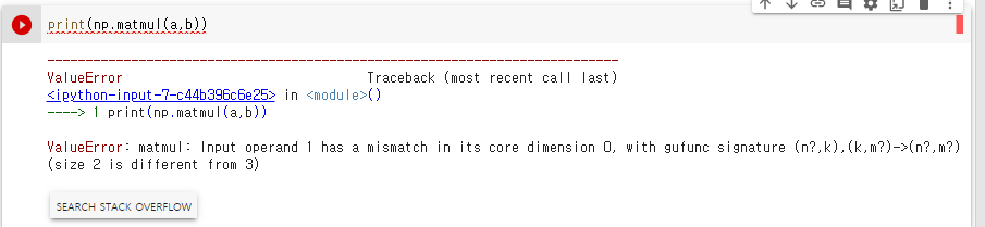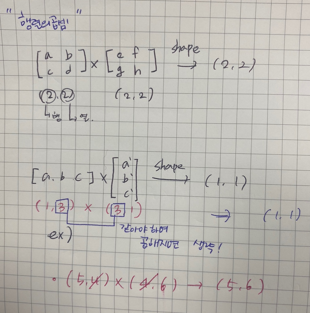 앞에 있는 열과 뒤에있는 행의 크기가 같아야만 연산이 가능하다.!!